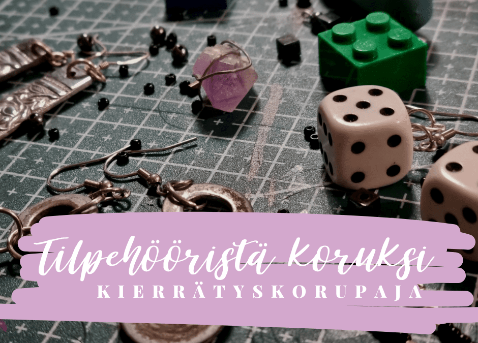 Tilpehöörille uusi elämä! Vanhentuneita kolikoita, karanneita helmiä, pudonneita nappeja, hylättyjä legoja, kadonneita avaimia – niistä on nämä korut tehty. Tule sinäkin tuunaamaan kierrätysmateriaalista koruja! Meidän jokaisen kotona on varmasti sellainen tuhatkori, jossa on kaikenlaista sekalaista, turhaa tavaraa ja tilpehööriä. Kaivele kätköjäsi ja anna tilpehöörille uusi elämä! Kun otat kotoa löytyvää tavaraa mukaan, voit tehdä erityisen persoonallisia koruja. Korupajassa on kuitenkin jo valmiina erilaista materiaalia, joten sinun ei välttämättä tarvitse tuoda mukanasi mitään.
